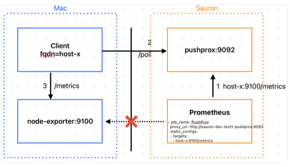 If you have a metrics server running from a lockdown tenancy such that the scrape target is not reachable from Sauron Prometheus, we can use PushProx which works on same Pull model using a Client/Proxy connection.